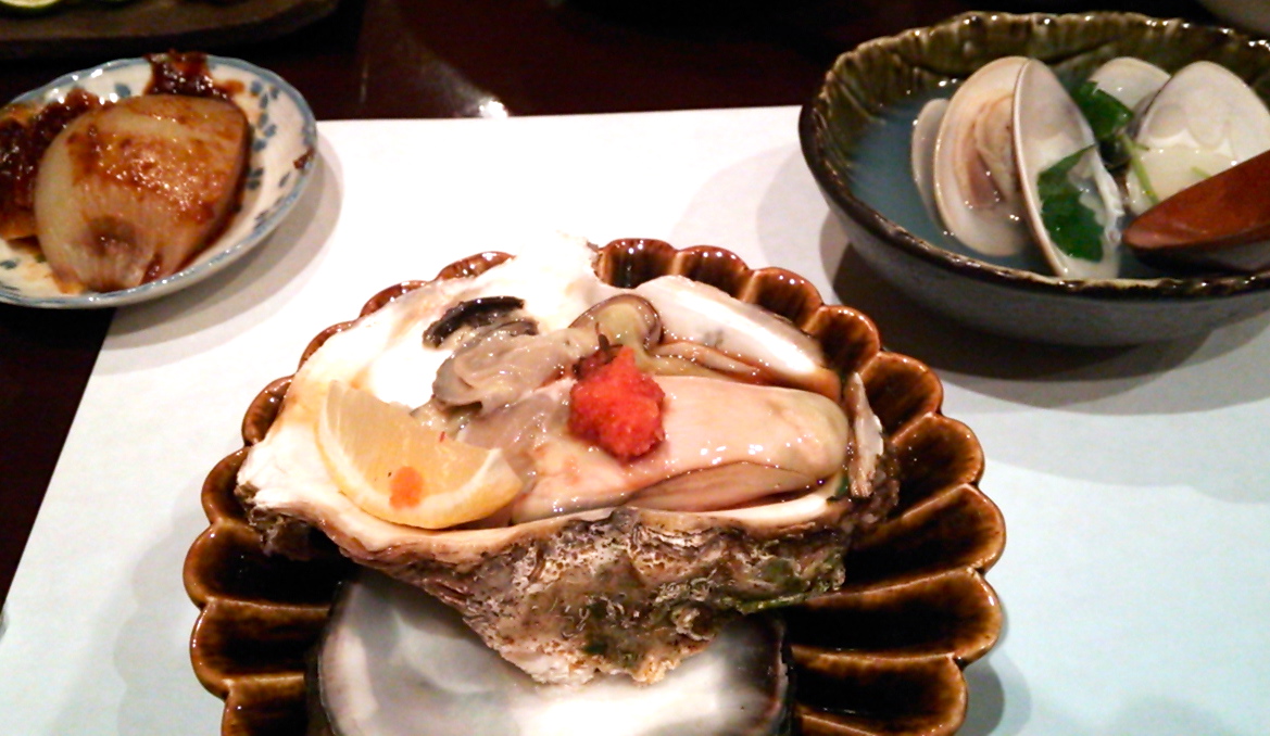 創作和食と丁寧に作られたおばんざいがメインのお店。大ぶりの岩牡蠣も濃厚でミルキーでした ♪