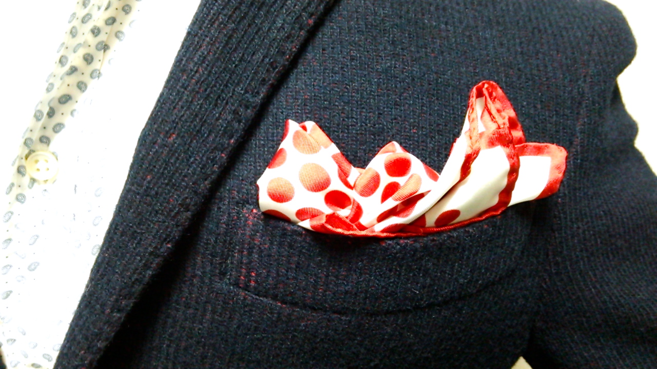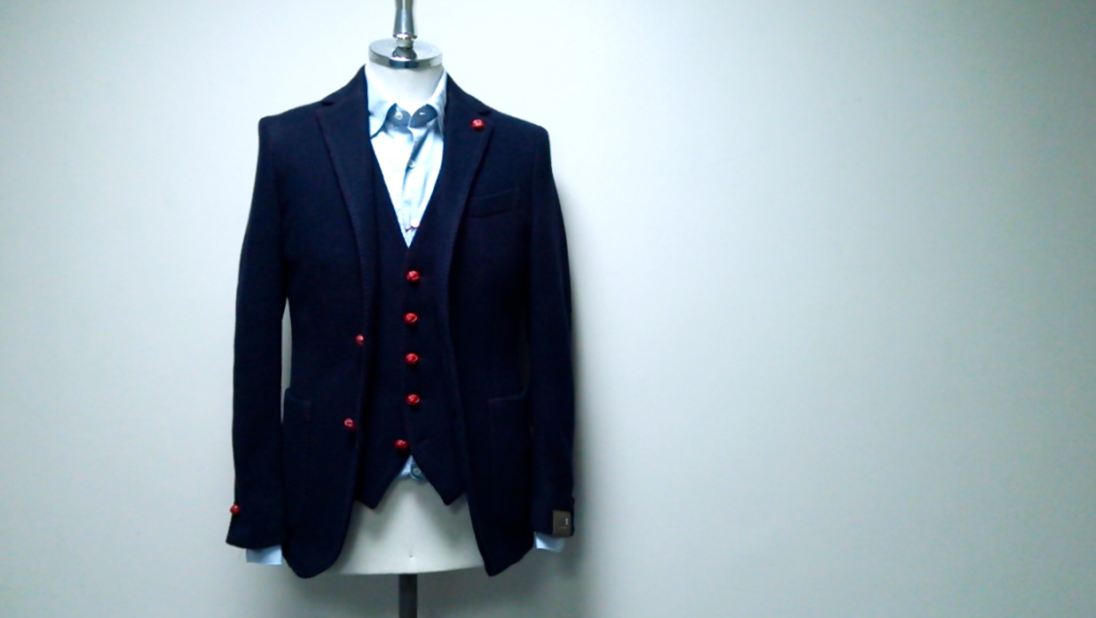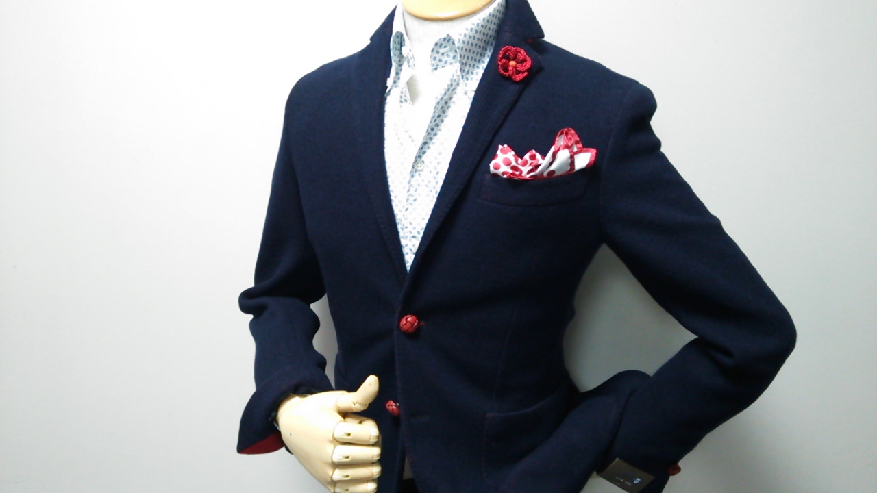 ネイビー地の下からほんのり赤が見え隠れする面白いファブリックなんですよ、コレが。