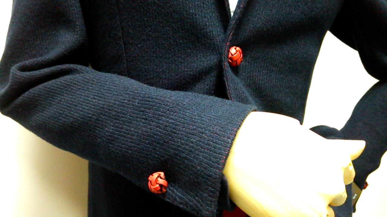 内側の赤に合わせてあしらわれた赤いバスケット釦も茶目っ気があってステキ。。