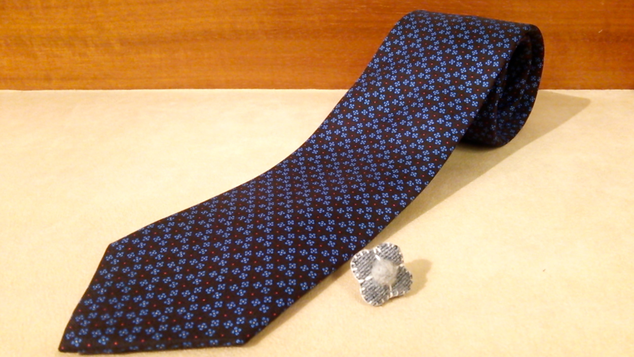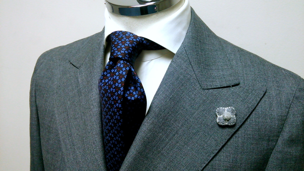 コーディネイトに合わせたカンティーニの新作ネクタイ。上質でもっちりとしたシルクのボディに繊細かつ美しい小紋のプリントがされています。私が個人的に大好きだったナポリの「E.G.CAPPELLI」に近しいモノを感じるとても上質なネクタイです。