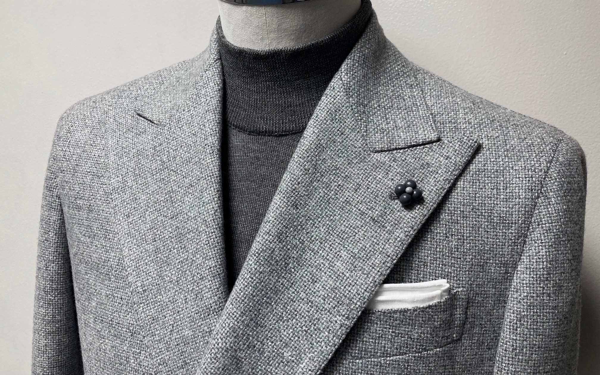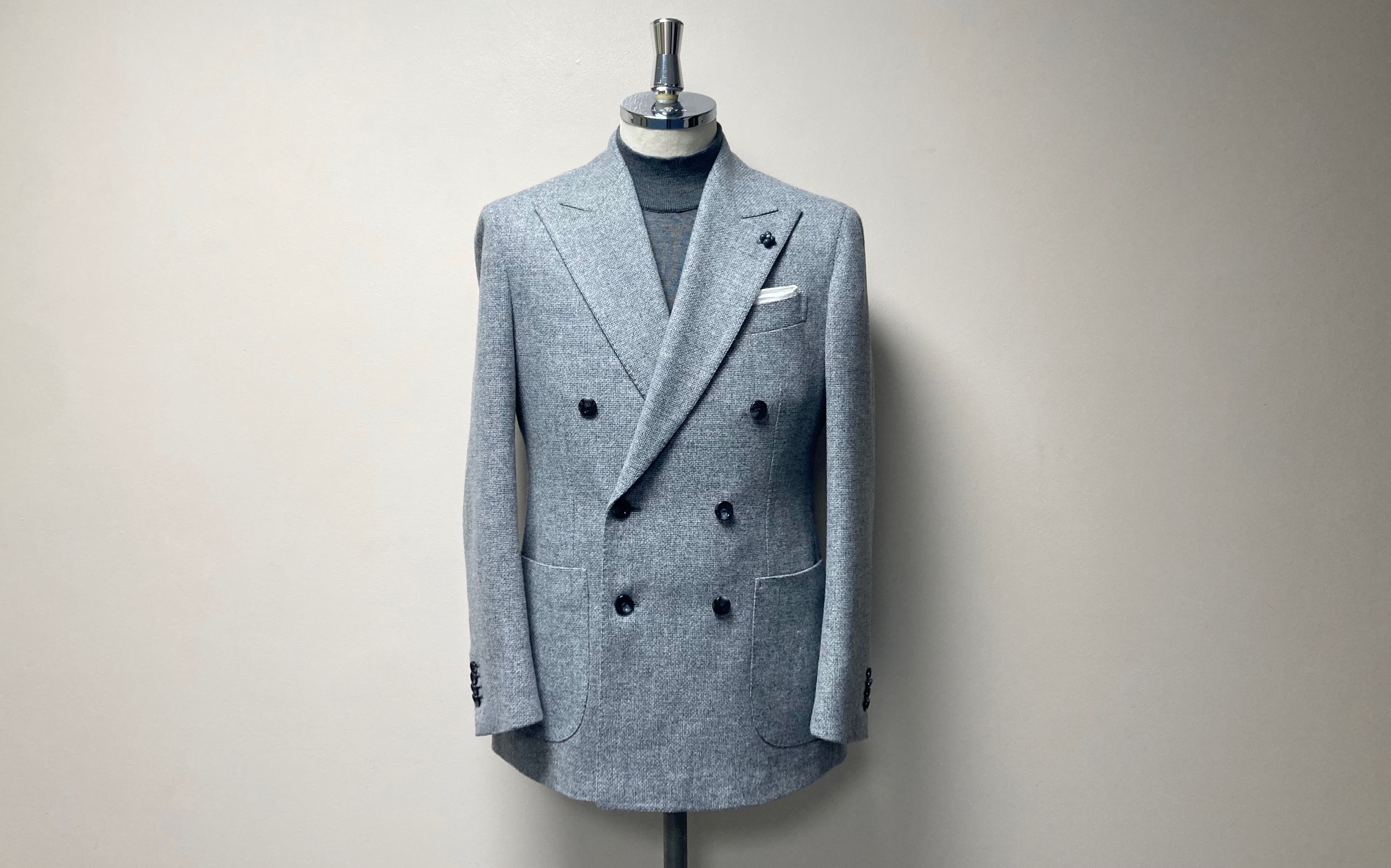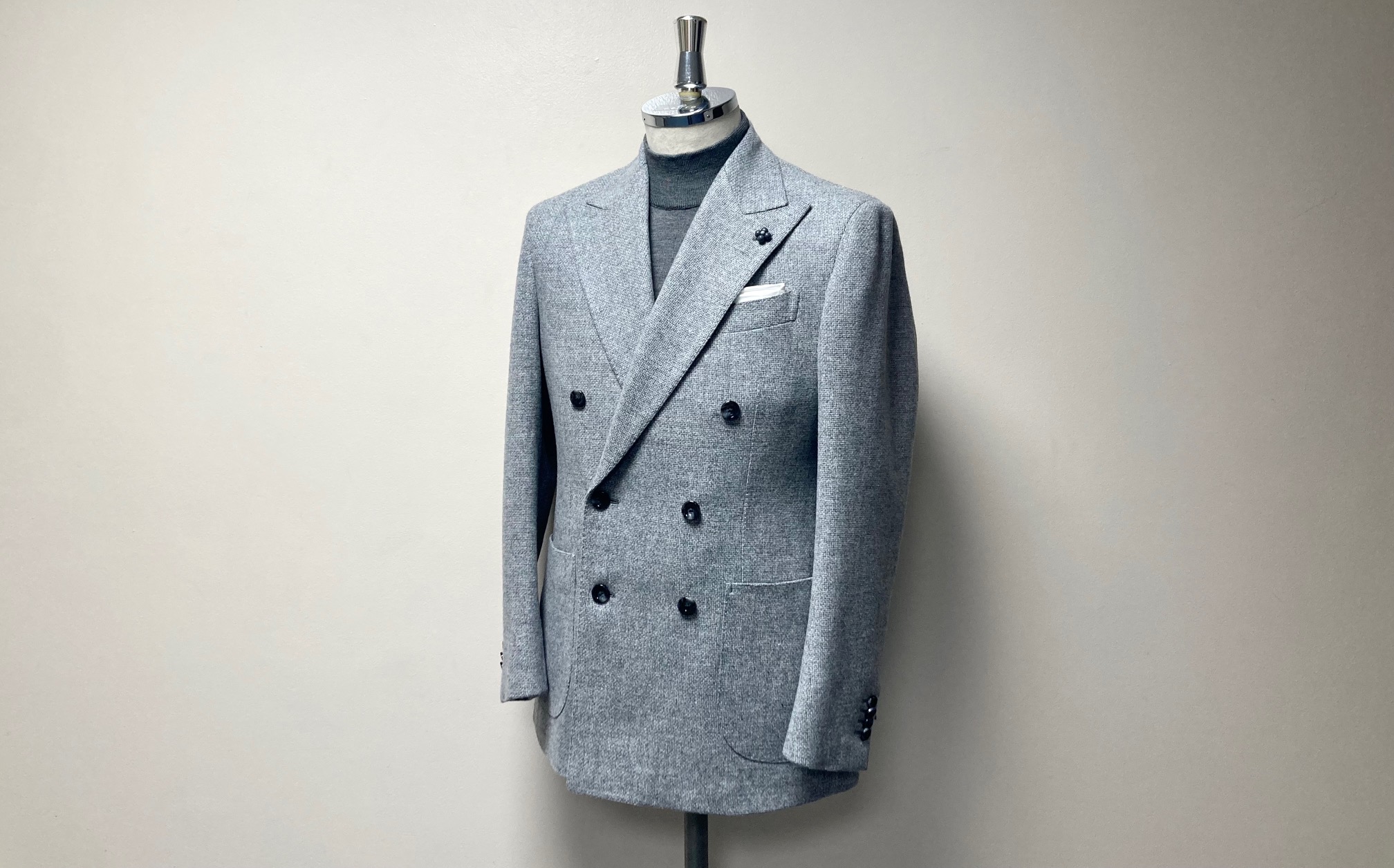 新年一着目の投稿は顧客様からのご依頼。お仕立てされたいサンプル画像を元にWジャケットをお作りしました。似寄りの生地をCENTOの定番、イタリアの『CANONICO/カノニコ』の中からライトグレー×メランジでご提案させていただきました!