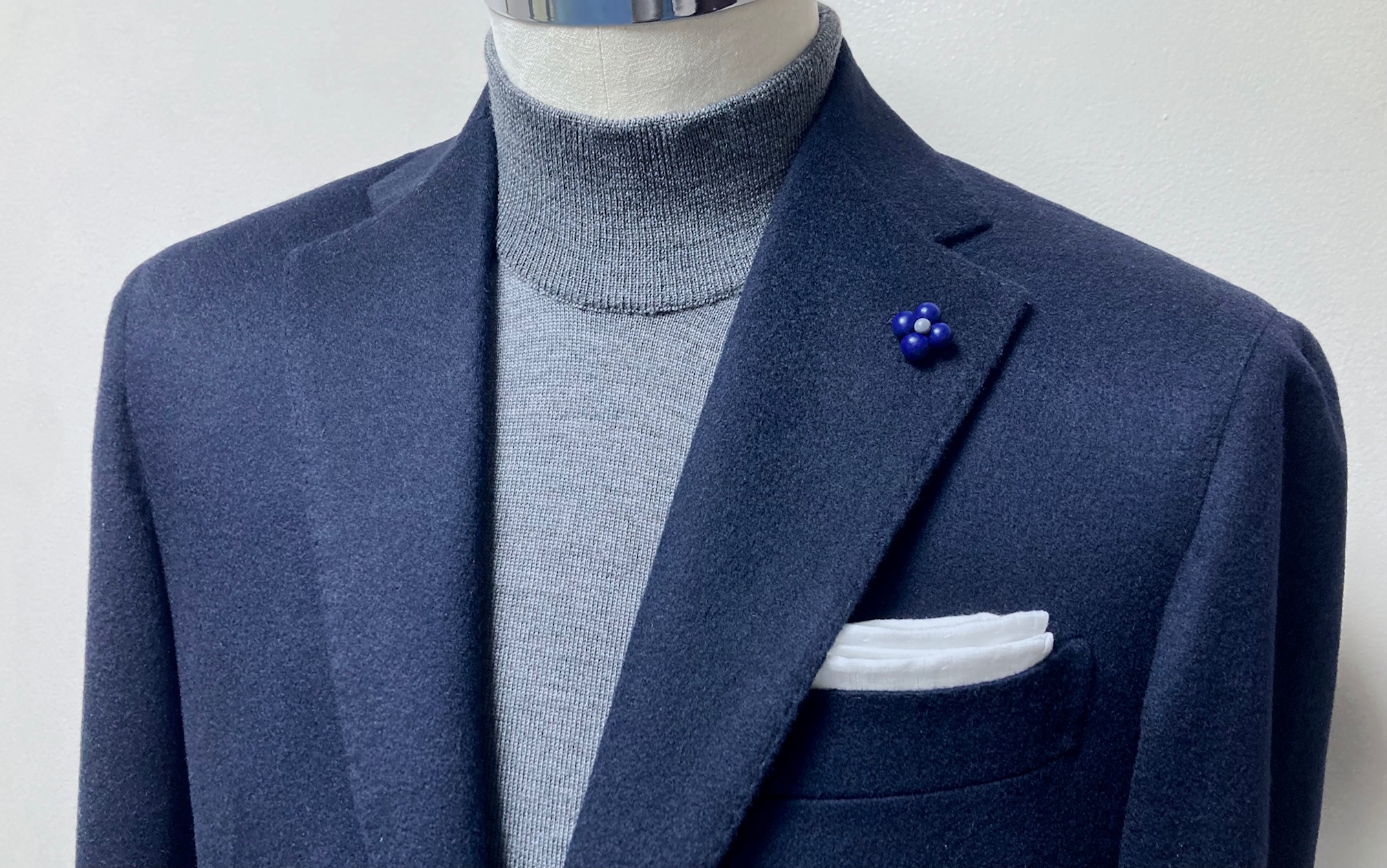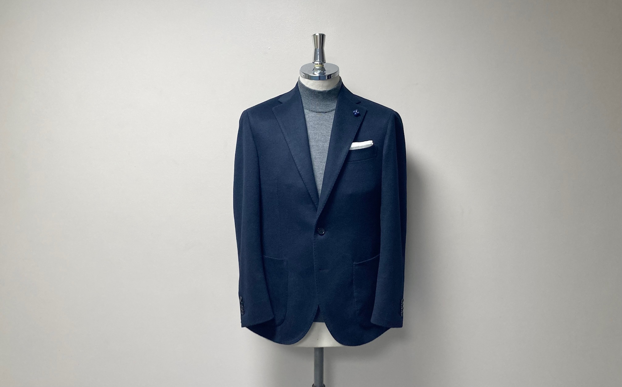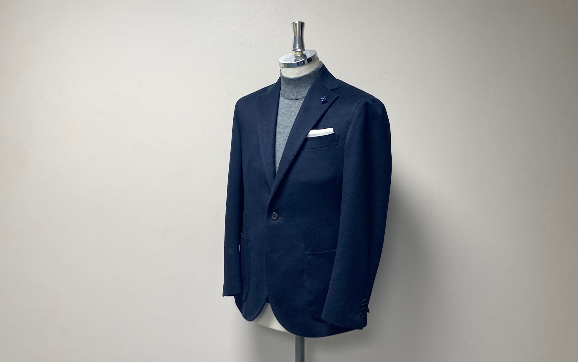 『カシミヤのジャケットを作りたい』とご注文いただいていましたオーダージャケットを先月納品しましたのでアップします。生地はイタリアの上質なカシミヤ100%のダークネイビーになります。