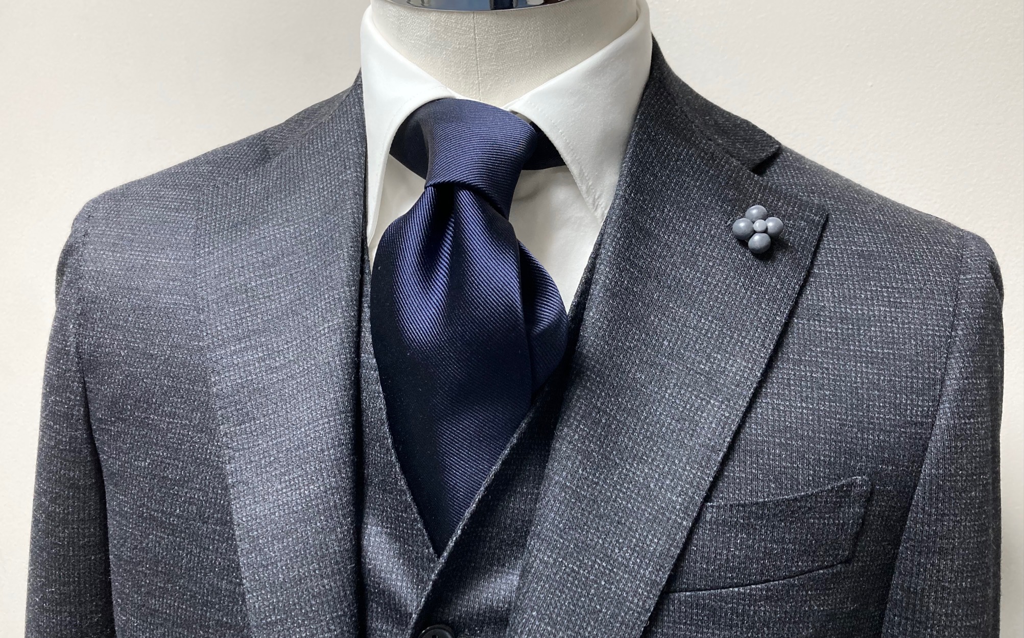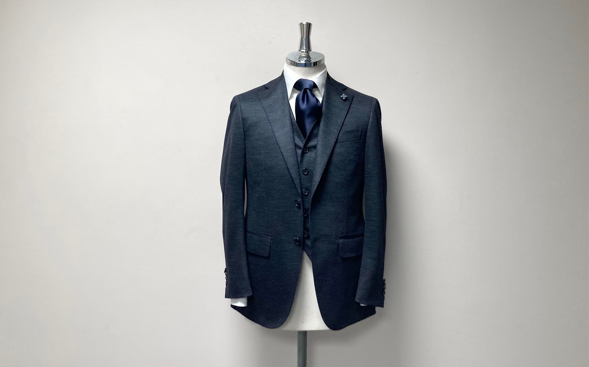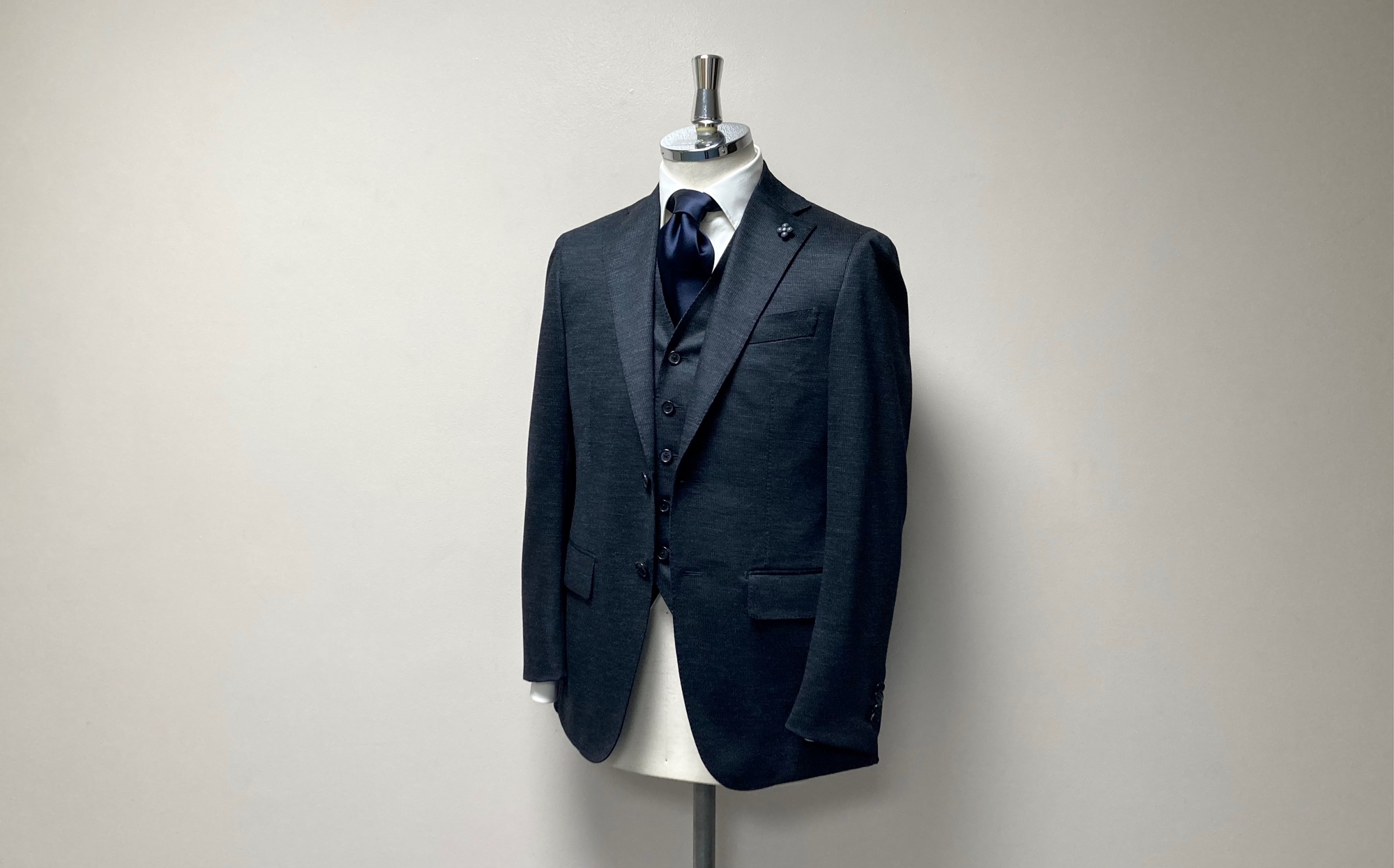 今シーズンにデビューしましたオーダー可能なジャージスーツの進化系『CENTO AIR/エアー』でご注文いただきましたウール100%のチャコール×ジャガード生地でスリーピースをご注文いただきましたのでアップします♪