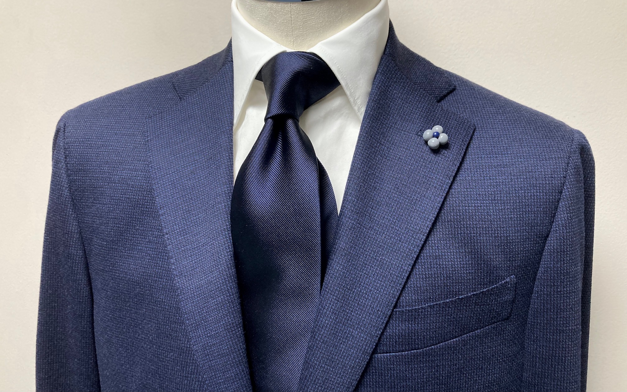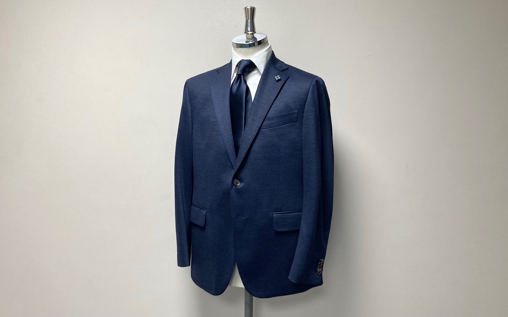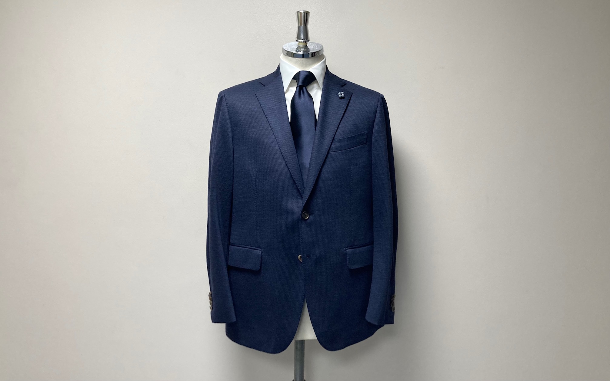 今シーズンにデビューしましたオーダー可能なジャージスーツの進化系『CENTO AIR/エアー』でご注文いただきましたウール100%のネイビー×ジャガード・スーツをご納品しましたのでアップします♪お久しぶりのご注文は私が雇われ店長の時にお世話になった60代の医院長先生。