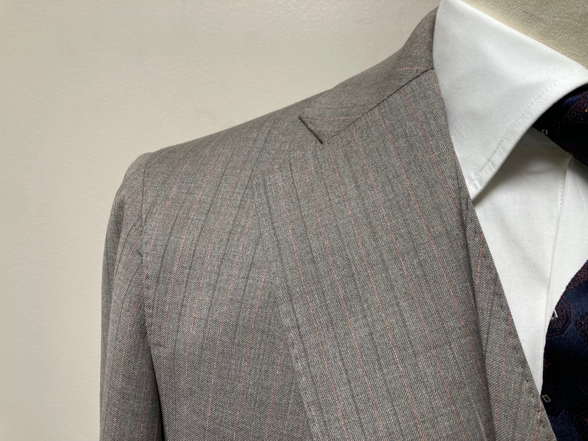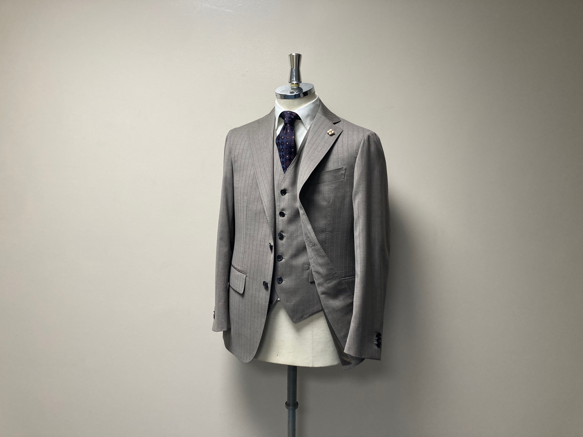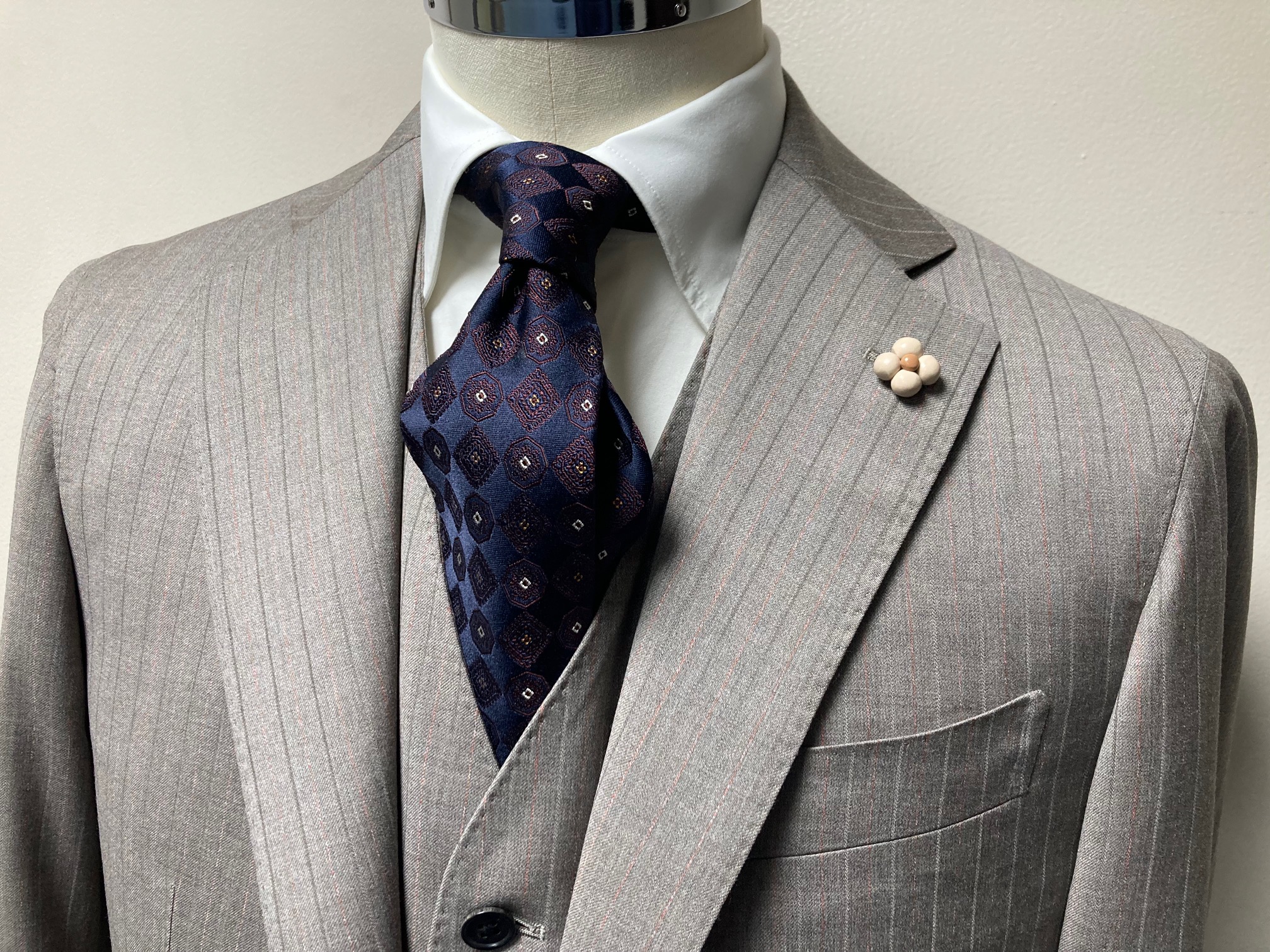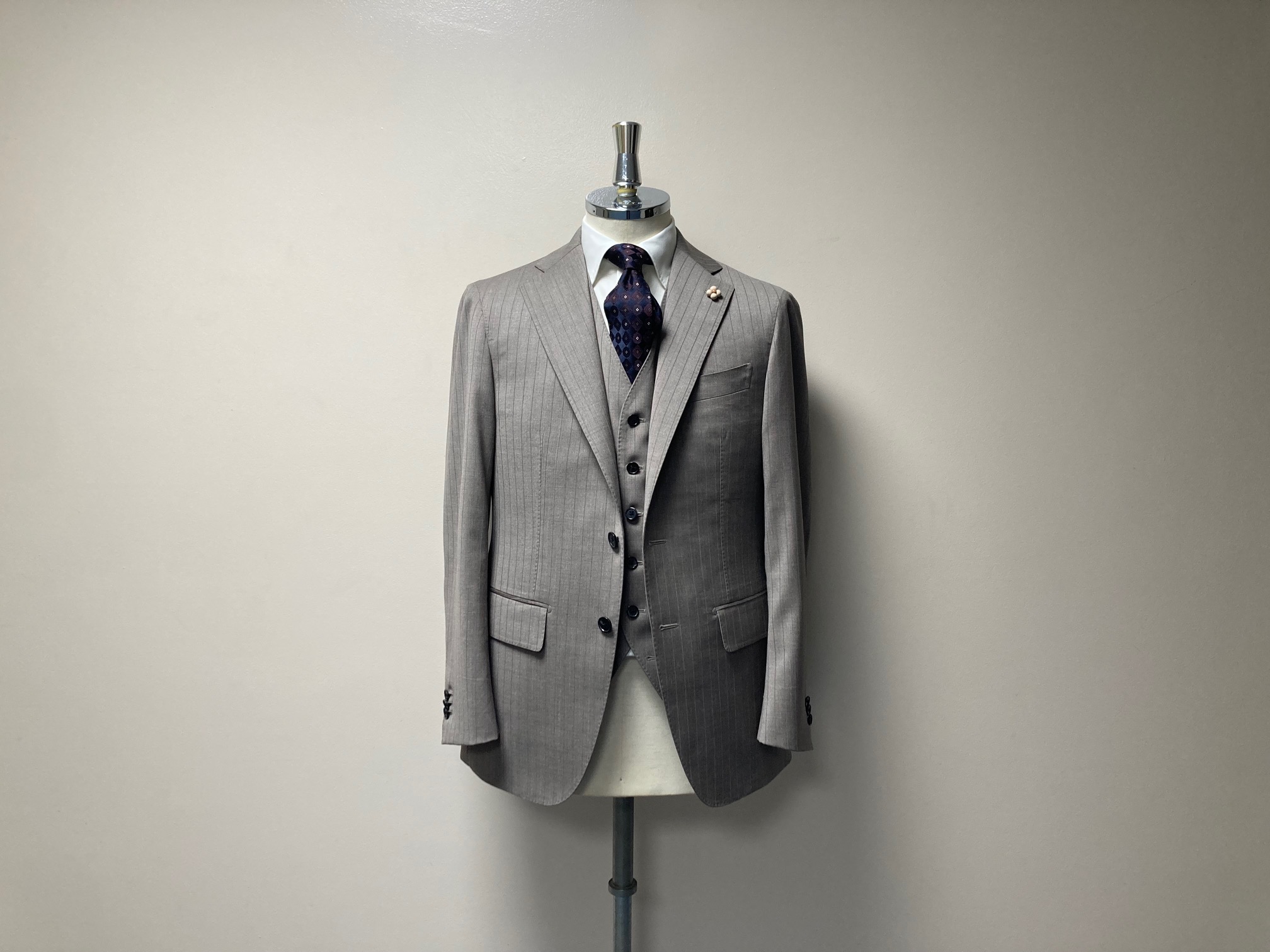 長年ご贔屓にしていただいています50代のお客様へ、お好みであろう生地をおススメしたところスリーピースでご注文くださいました!その生地は1865年創業のイタリアの名門服地メーカー「REDA/レダ」社の『SILKY EFFECT/シルキーエフェクト』コレクションの中からグレーがかったベージュ×オレンジストライプ。