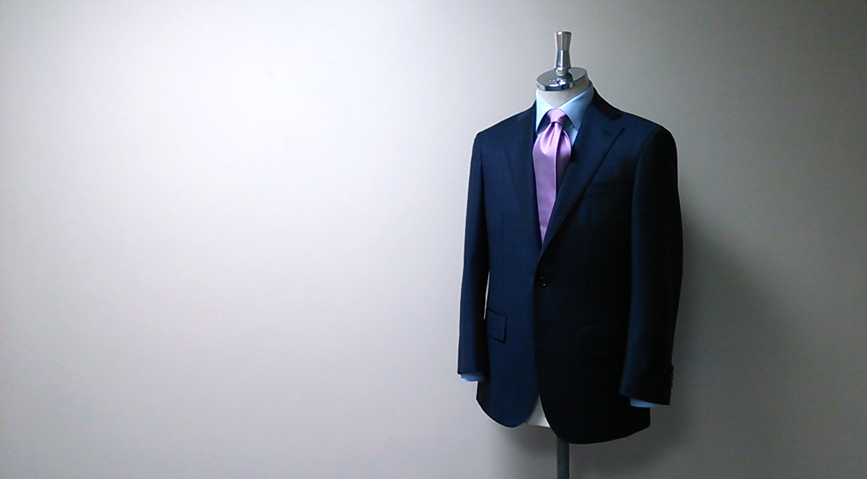 DORMEUILのアマデウス365の中からお選びいただいたネイビー地にパープルのチェックが走った生地でお仕立てしたスーツをアップします。