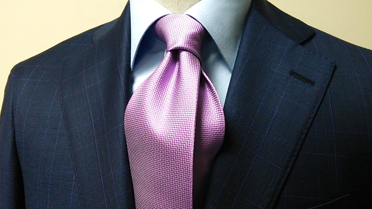離れて見るとネイビー無地に、近づくと見えるうっすらと走るパープルチェックが。。主張し過ぎない 柄・デザインチョイスには拘りのアイデンティティーを感じずにはいられませんね。
