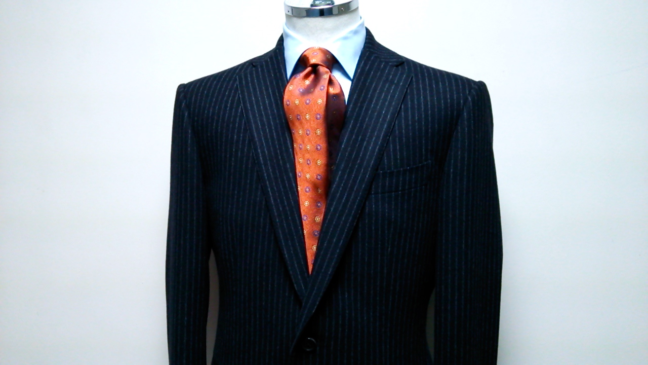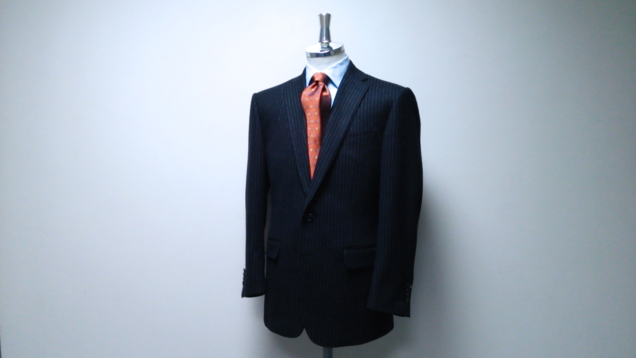 御幸毛織り別注の生地で仕立てたオーダースーツが仕立て上がりましたのでアップしますね。肉厚なフランネル素材のダークネイビー カラーに細めのチョ−クストライプが走っています。