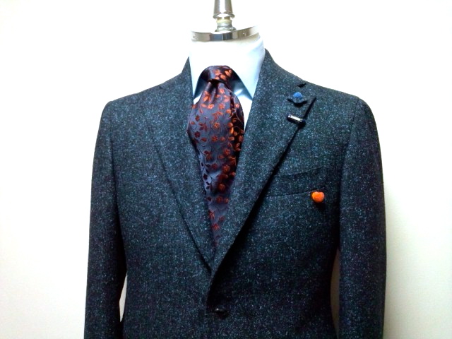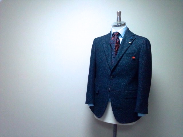 生地はTALLIA DI DELFINO(タリアデルフィノ:伊)のネップツイード、カラーは青みを帯びたネイビーです。