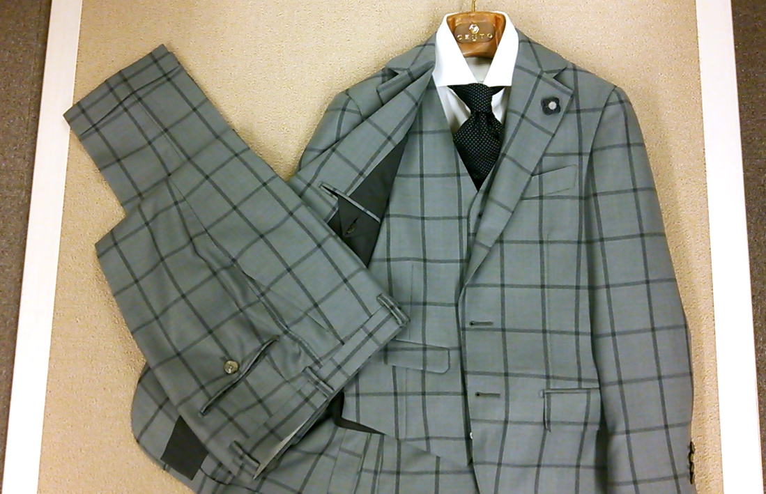 ドーメルのAMDEUS 365 JACKETINGSの生地の中から大きめな格子柄をセレクトし、あえての3ピースの2釦スーツを仕立てました。