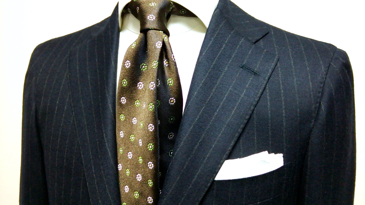 しっかりとした目付けのサキソニー地でカラーは深い紺にクラシックなチョークストライプ、CENTOでいうところのまさにお手本のようなスーツです。