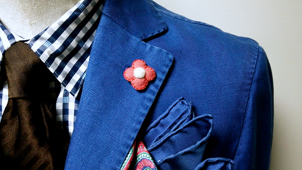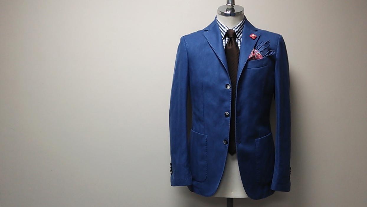 一枚仕立てで洗いがかったロイヤルブルーと素材感のあるヘリンボーン柄。清涼感に清潔感のある色気がミックスされた大人ジャケットです。