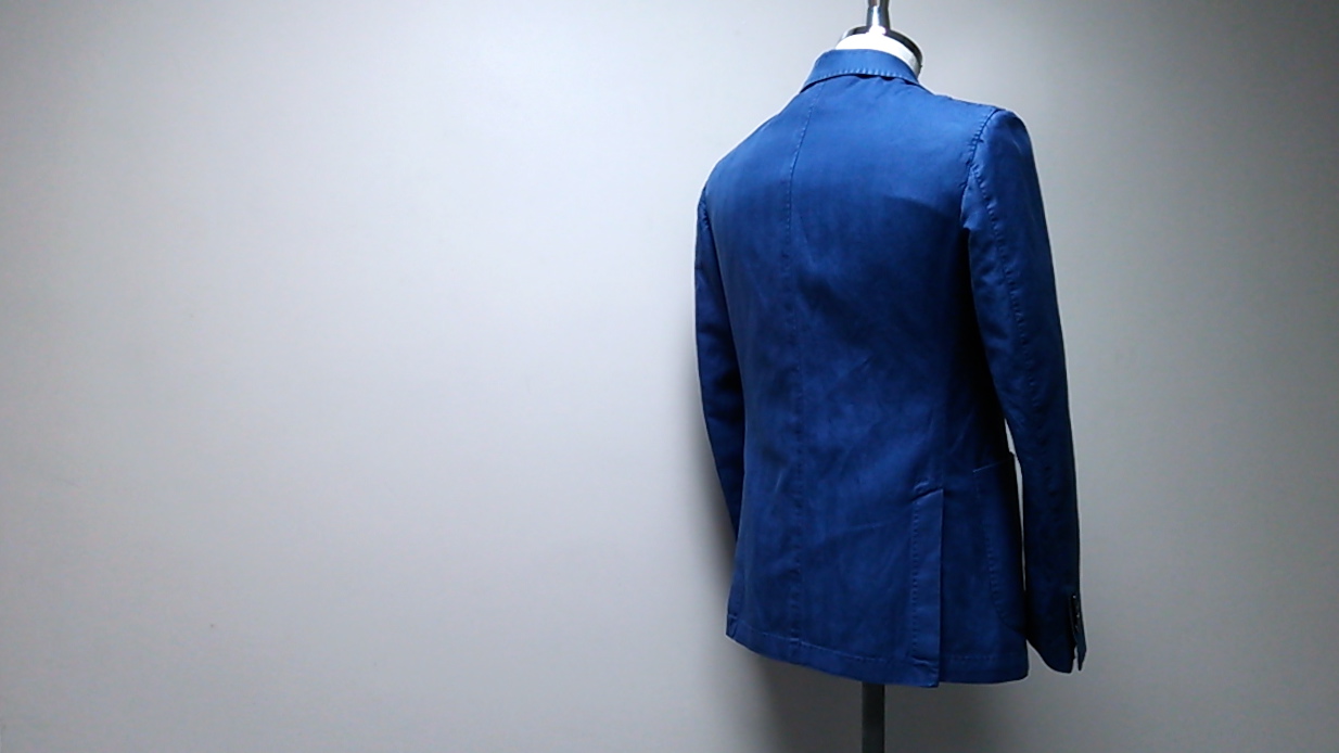 シングルの3釦、腰にはパッチポケットが付きます。イタリアンな佇まい、強過ぎないロイヤルブルーがミソです!