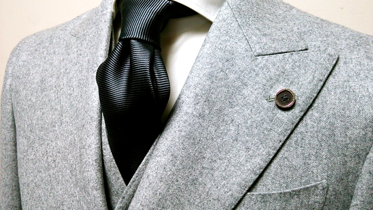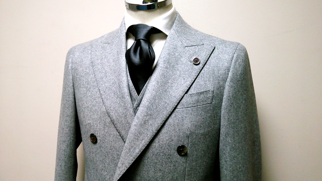 カノニコ製ライトグレーのフランネルでご注文いただいたベスト付きダブルブレステッドのスーツが仕立て上がりましたのでアップします。
