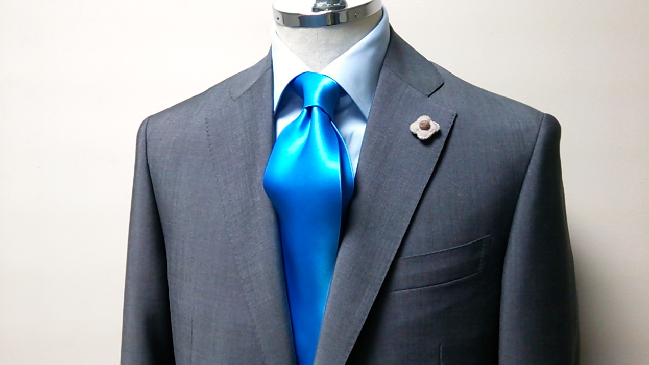 最高級シルクサテンを使ったヴィヴィッドな水色のネクタイで色気をプラス。