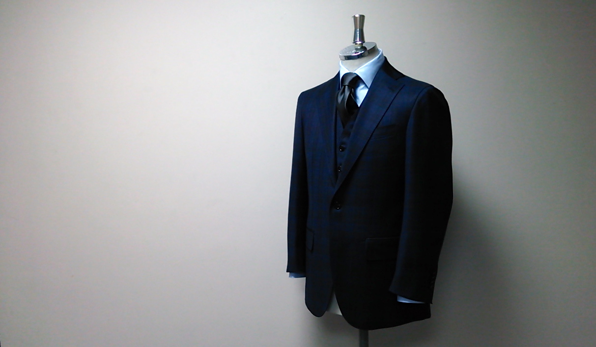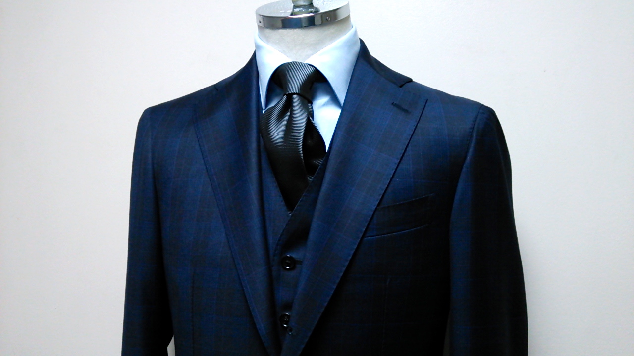 CENTOでは安定した人気を誇るDORMEUILのアマデウスの中からお選びいただいたミッドナイトチェックで誂えたスリーピースがとてもハンサムに仕立て上がりました。
