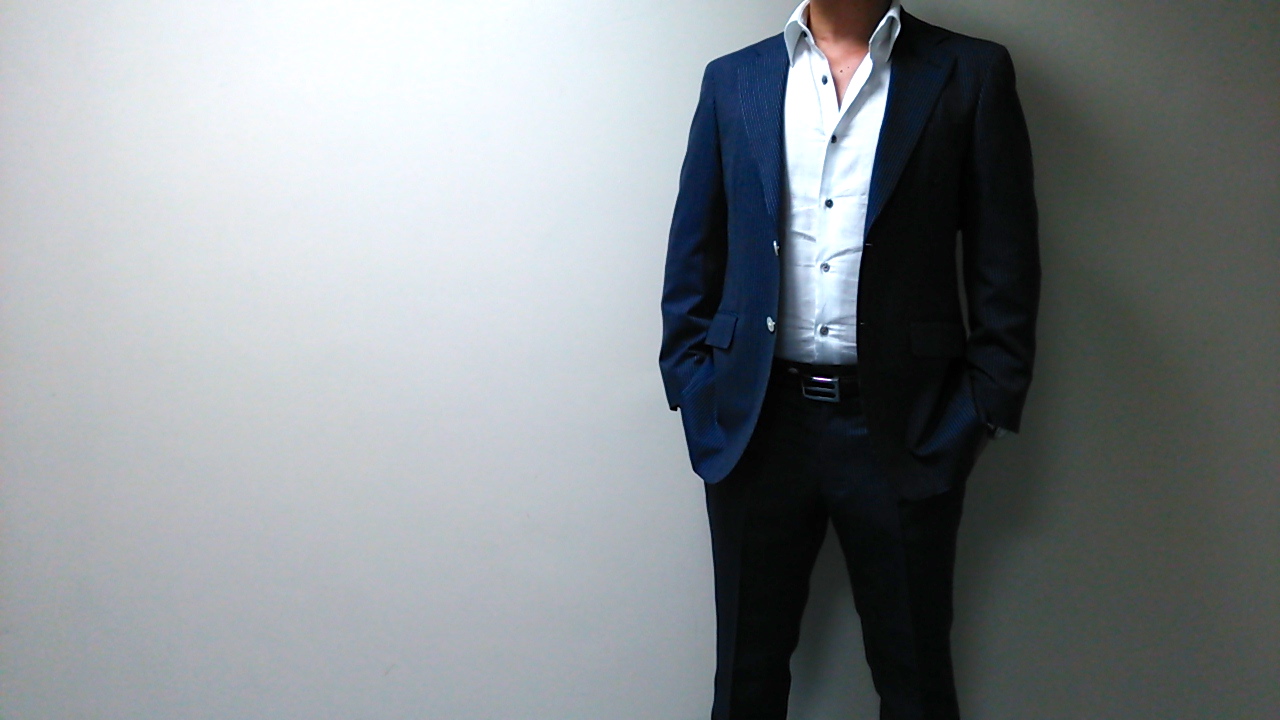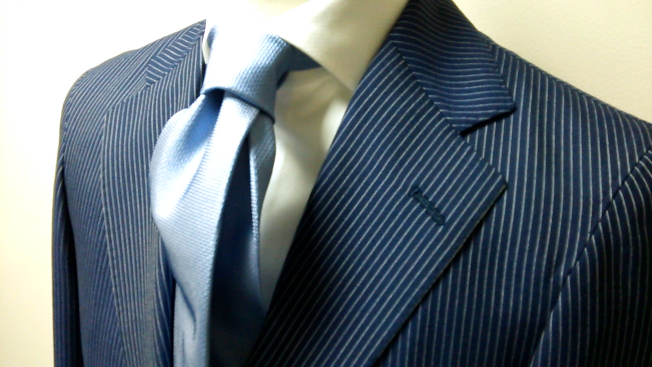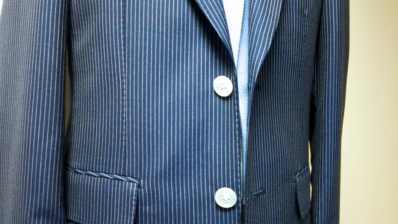 白蝶貝でスーツに華やかさと軽さを。ボタンホールの色はあくまで白ではなくネイビーにしているところもポイントです。