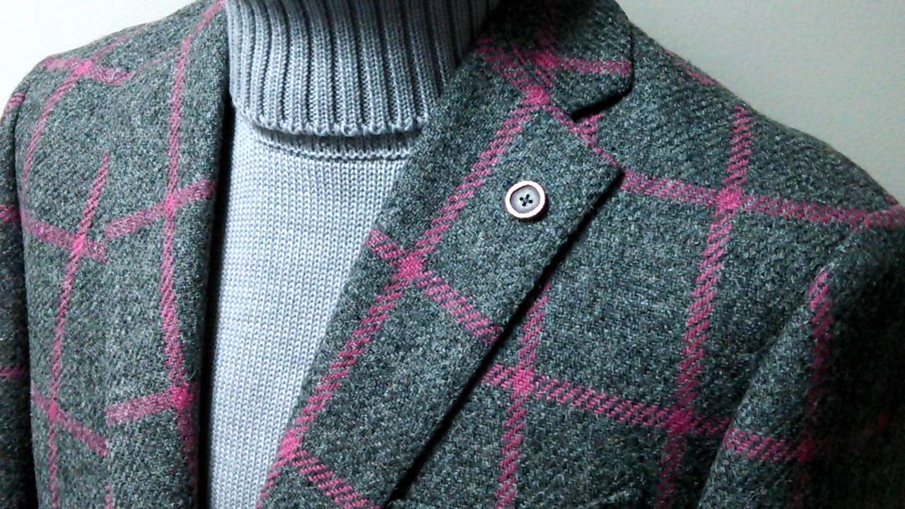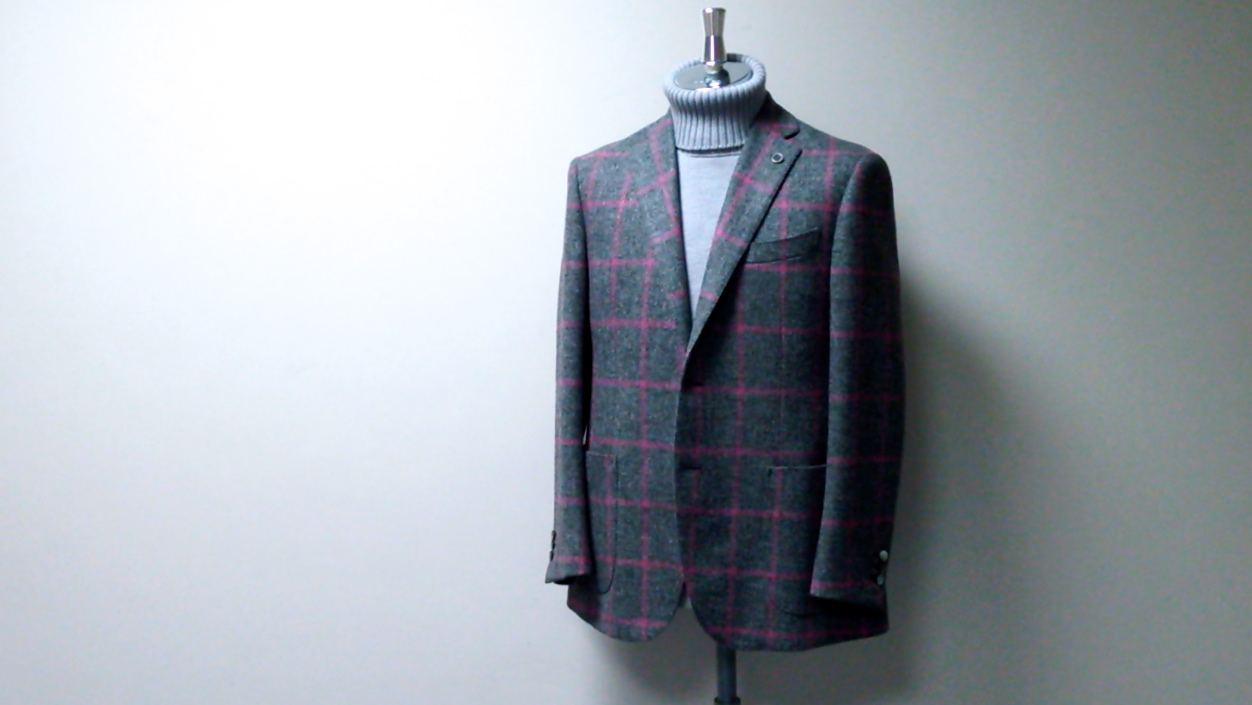CENTOで好評のピンクチェックでお仕立てしたツイードのジャケットが仕上がりましたのでアップします。生地は英国マーチャントの雄「HARRISONS OF EDINBURGH」の創立150周年記念のアニバーサリーツイード、世界展開で限定生地の為2ヶ月足らずで完売した希少生地であります。