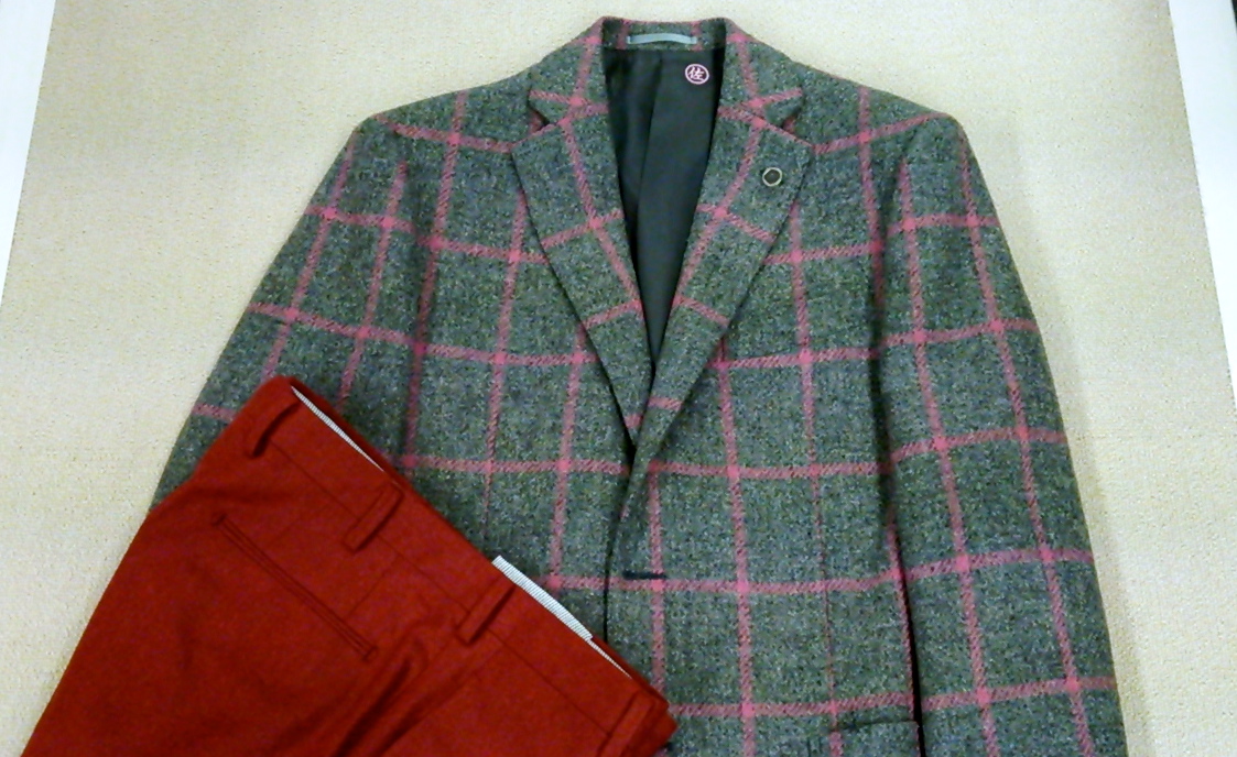 ジャケットに合わせてチャコール、ネイビー、レッドのウールパンツもご一緒にご注文いただきました。画像はその中からレッドのウールパンツを添えて。