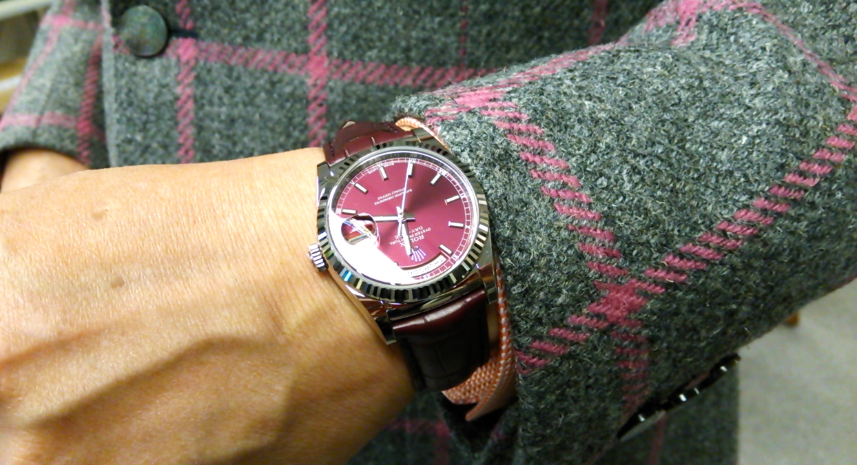 ご納品時にされていたブルゴーニュカラーのロレックス・デイデイトをパシャリさせていただきました。ピンクチェックとも好相性ですね ♪