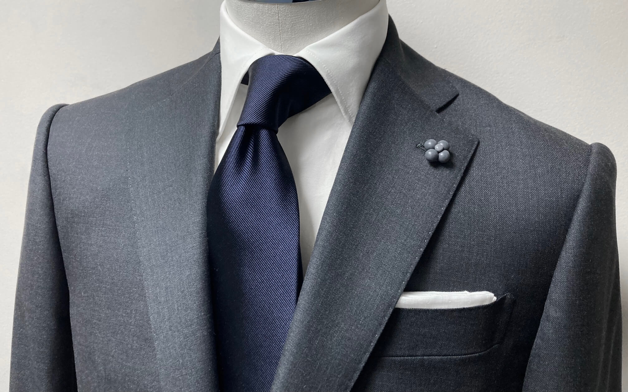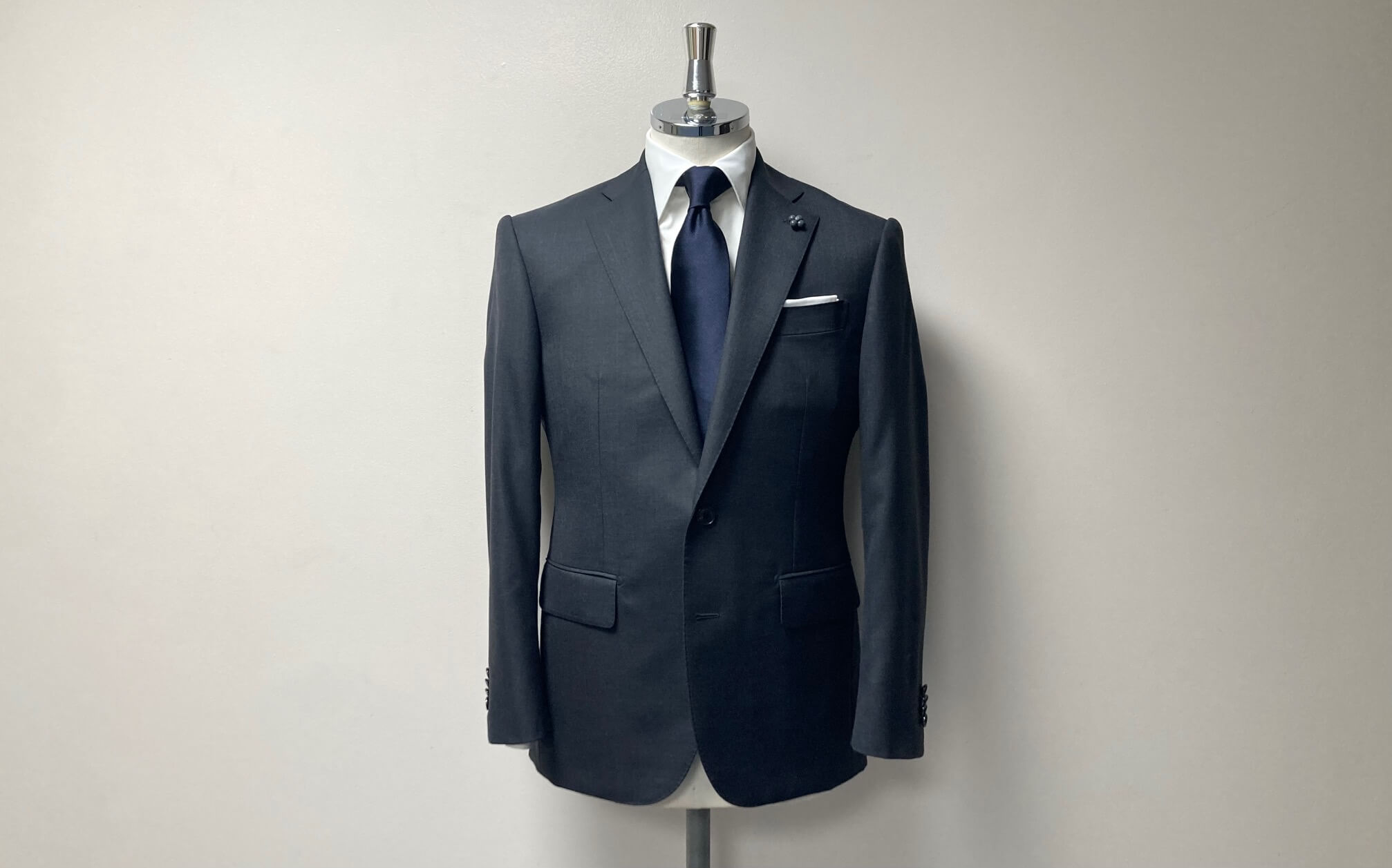 イタリアの高級服地ブランド、『FRATELLI TALLIA DI DELFINO/タリア・ディ・デルフィノ』。その中からチャコールグレーの生地でお仕立てしたオーダースーツをご紹介します♪