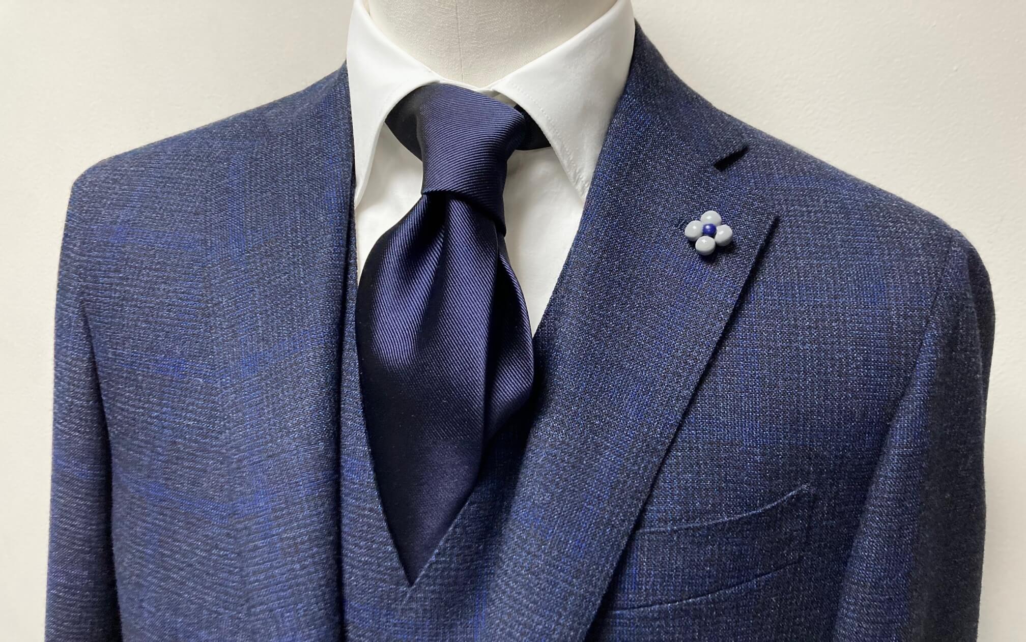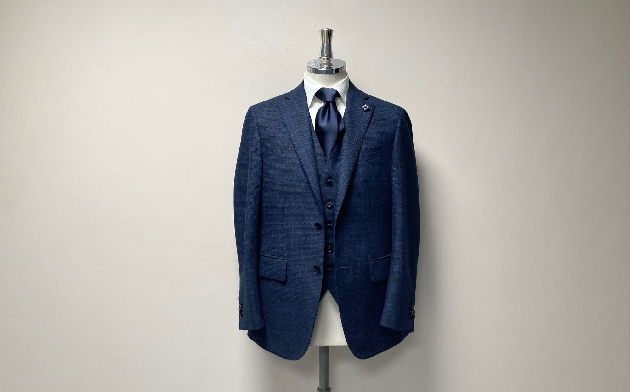 40代のお客様から久しぶりのオーダー。ネイビーベースで、ややカジュアル感のあるスーツをとのご依頼。数ある生地の中からヒアリングした結果、ネイビー×グレンチェックの生地で、スリーピース&スペアスラックス付でご注文いただきました!