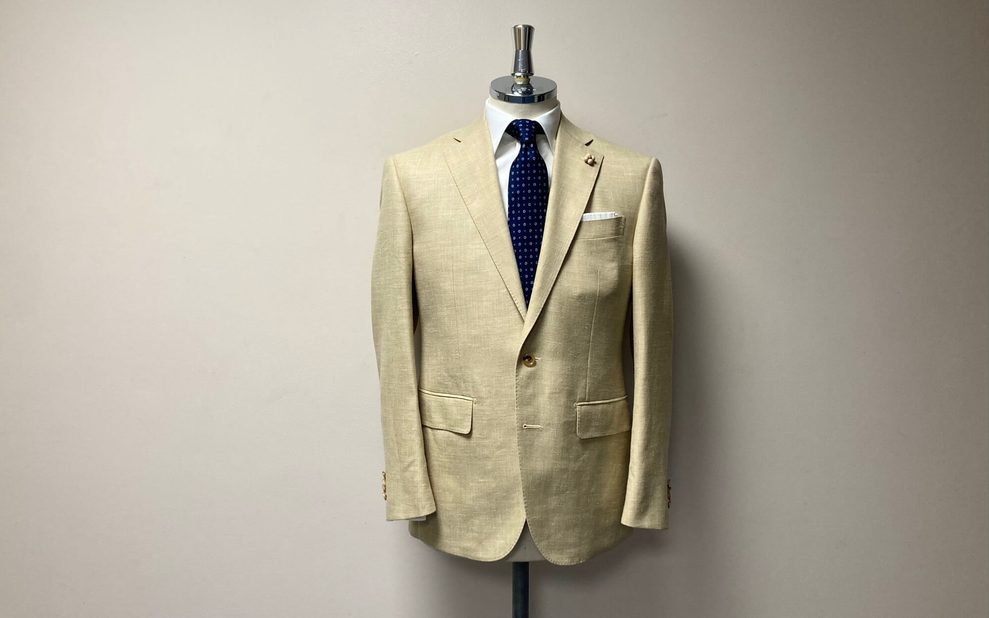 ご依頼の生地はしっとりした肌触り。かつ清涼感のある、混率ウール35%×バンブー23%×シルク22%×リネン20%の4者混、カラーは拘りのイエローベージュ。